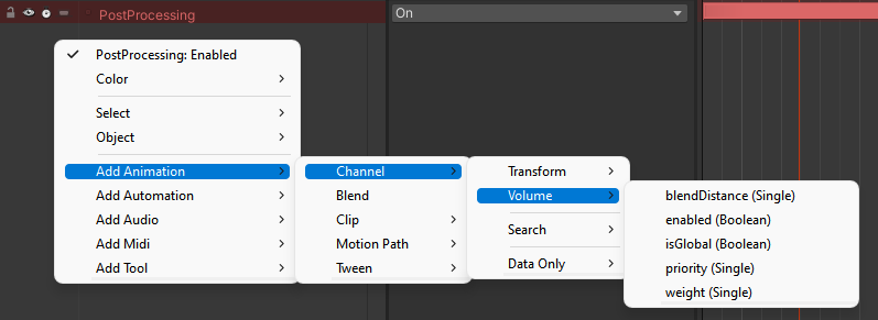 Whether using HDRP or URP, Volume component parameters for post processing effects may be animated using any behavior. When the project is properly configured, the properties for each effect are listed in the property selection menu. However, if the configuration is missing then only the basic Volume parameters are displayed.